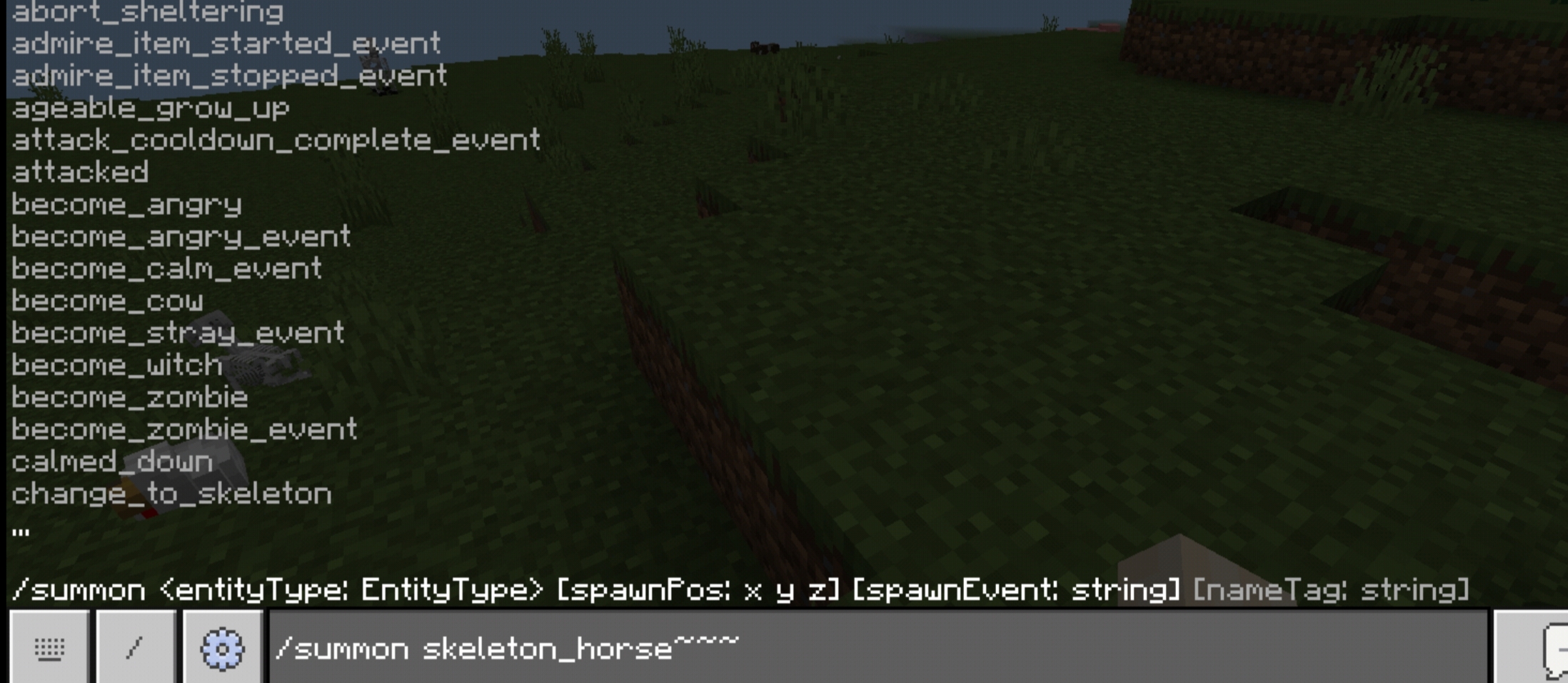 2、在聊天框輸入輸入「/summon skeleton_horse~~~」生成字元,會生成骷髏馬。