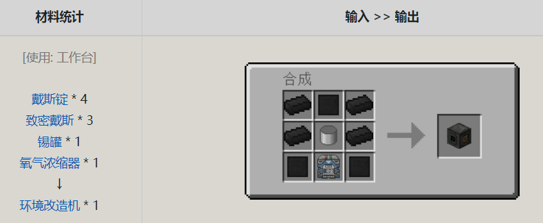 首頁 我的世界 問答 mc環境改造器怎麼做? 2022-09-06 在工作台上,用4個戴斯錠、3個緻密戴斯、1個錫罐、1個氧氣濃縮器就可以合成環境改造機(器)。環境改造器是一個強大的可以改造環境的的設備,使用不同的晶元將產生不同的效果。環境改造器能夠將荒涼的月面,火星表面進行環境改造。