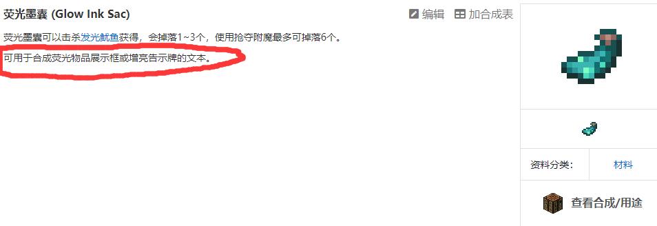我們可以搜索並進入熒光墨囊的相關說明,然後就可以在界面上方發現熒光墨囊可用於合成熒光物品展示框或增亮告示牌的文本。