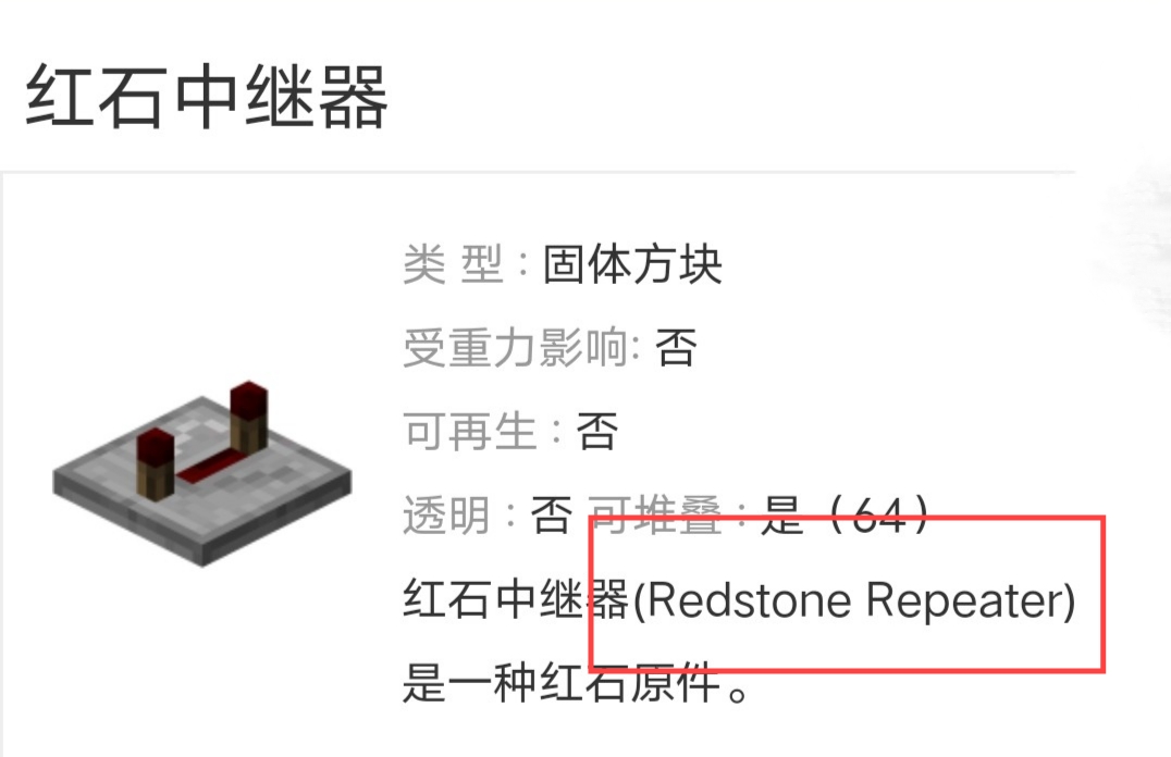 首頁 我的世界 問答 我的世界紅石中繼器英文是什麼? 2022-09-07 Redstone Repeater。紅石中繼器(Redstone Repeater)在紅石電路中是用於「中繼」紅石信號並放大、阻止信號倒流或者「鎖存」信號狀態的方塊。