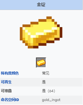 首頁 我的世界 問答 我的世界金錠英文是什麼? 2022-09-08 金錠(Gold Ingot)是一種用於製作多種物品的金屬錠,同時也是用於以物易物的物品,玩家可以通過對豬靈使用或扔出金錠來與之進行以物易物,豬靈收到金錠後會給予玩家特定物品。