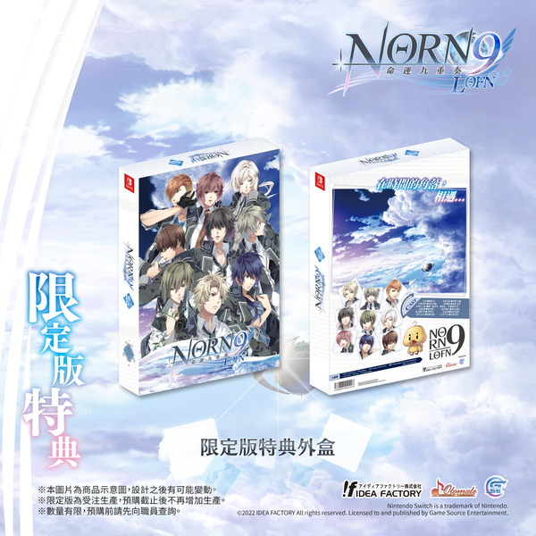 [香港,2022年7月04日] Game Source Entertainment (GSE) 宣佈,將與「Idea Factory」旗下乙女遊戲品牌「Otomate」合作,推出人氣經典乙女遊戲作品《命運九重奏 -NORN9 LOFN-》Nintendo Switch™繁體中文版,並預定於2022年內與大家見面。此版本合併了本篇《NORN9: Var Commons》及續篇《NORN9: LAST ERA》的故事,保證玩家能充分體驗與9位可攻略角色的《NORN9》之旅。踏上旅程之前,今天將為大家公開《命運九重奏 -NORN9 LOFN-》的預購及限定特典。