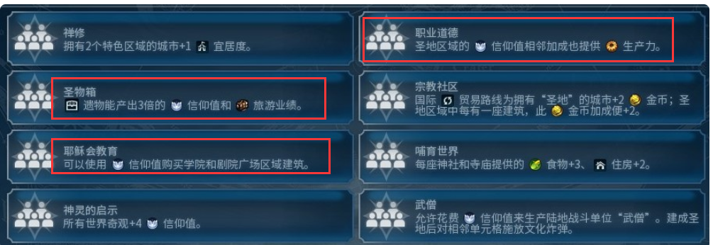 宗教勝利有用信條Pilgrimage 從每座國外信教城市獲得 2聖秩聖事Holy Orders 用 購買本宗教的傳教士和使徒時,消耗減少30%避世修行Monastic Isolation 本宗教的宗教
