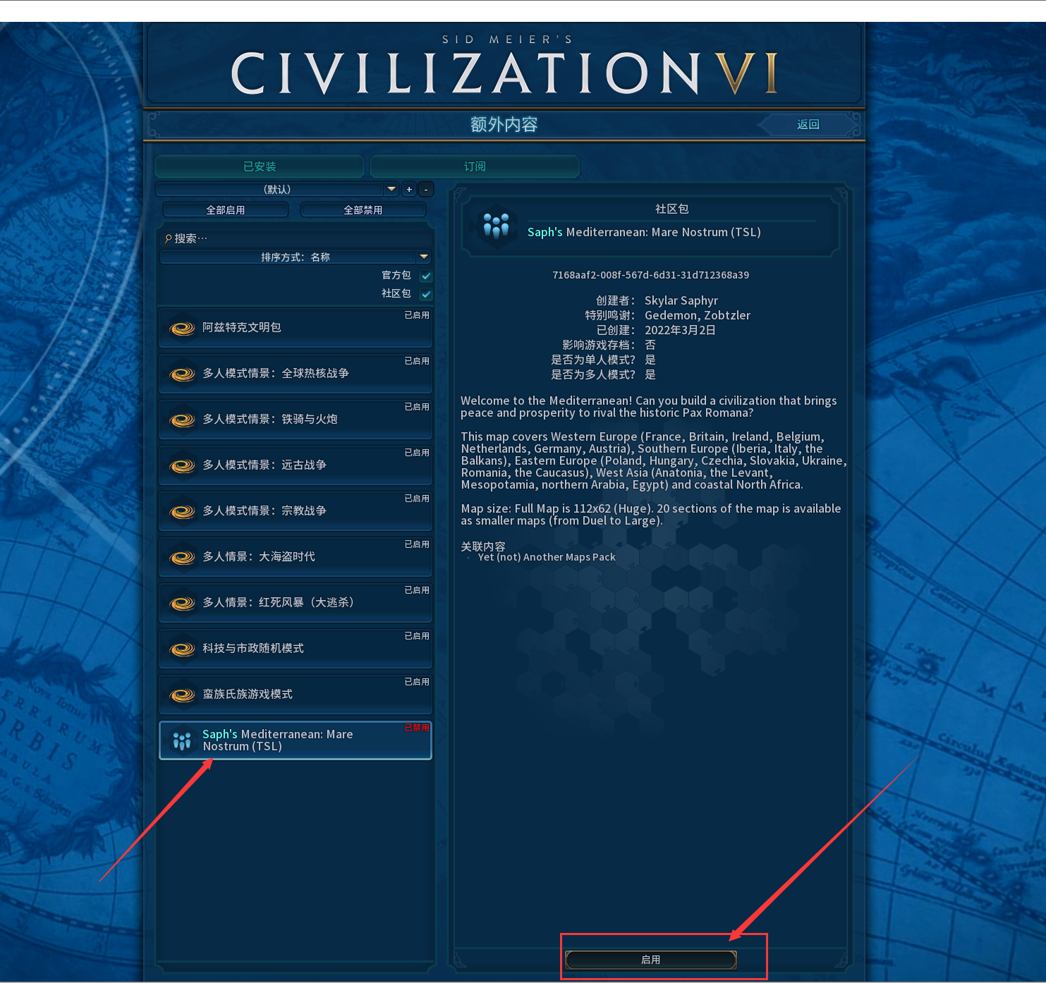 首頁 文明6 問答 文明6如何啟用創意工坊mod? 2022-09-09 1.玩家進入遊戲後,點擊主菜單中的額外內容選項,然後再點擊模組選項。2.進入模組界面後,在左側找到並點擊自己訂閱下載的創意工坊MOD,最後點擊右下角的啟用選項即可。