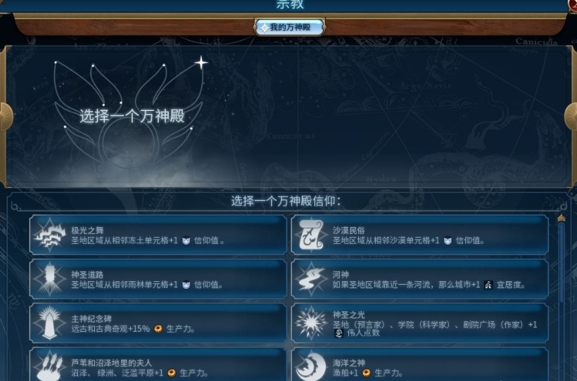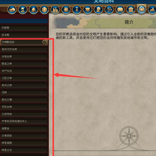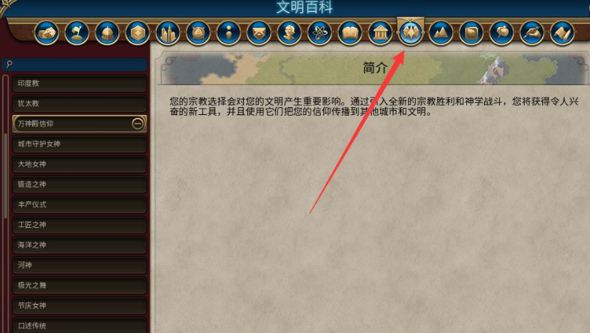 首頁 文明6 問答 文明6萬神殿怎麼觸發? 2022-09-09 1、首先我們打開文明百科。2、裡面有每一種萬神殿的功能的介紹。3、玩宗教勝利的可以先選擇聖地科技。4、政策選擇加一金幣和一信仰。5、當信仰累計到一定程度會觸發萬神殿。6、選擇自己的萬神殿即可。