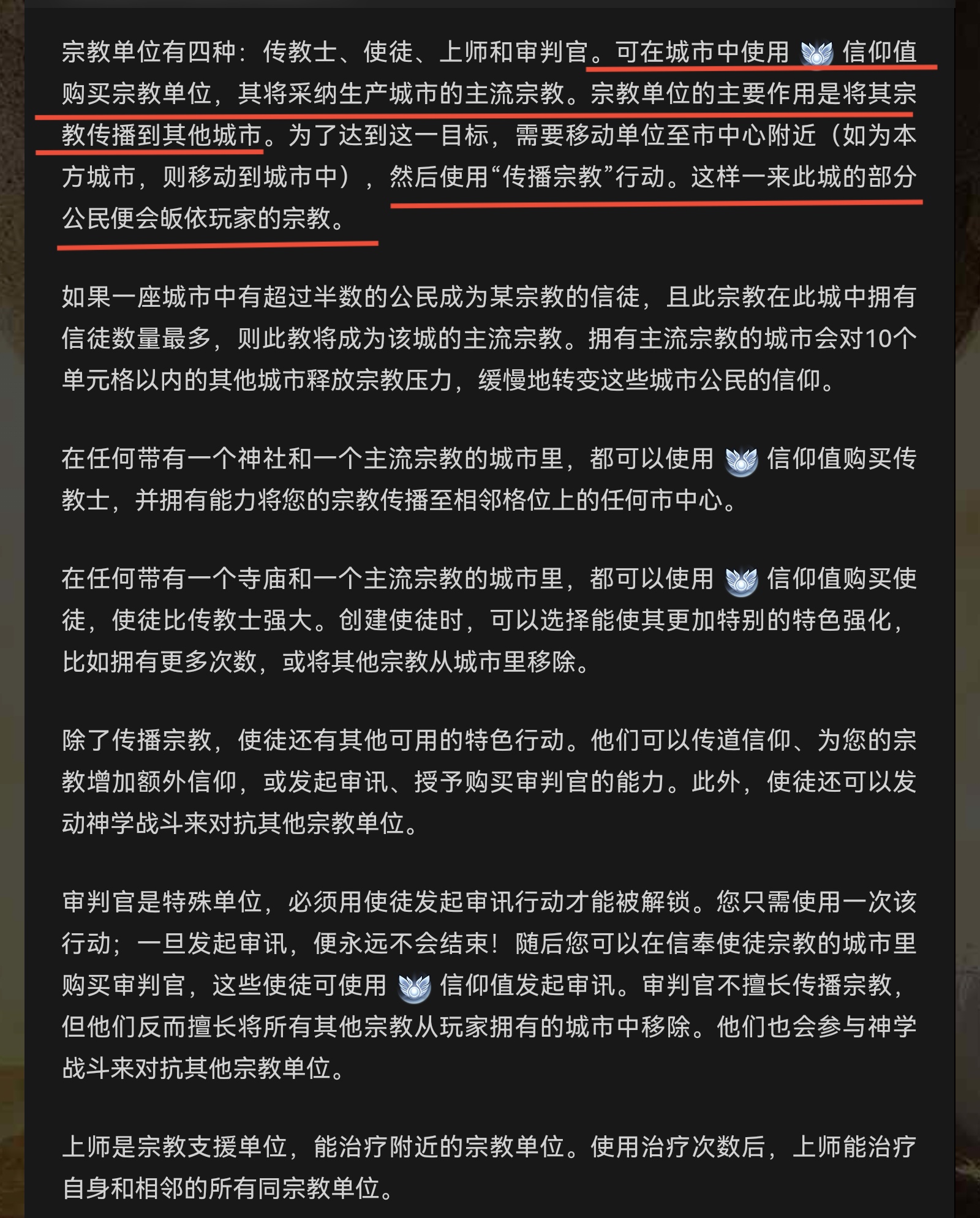 首頁 文明6 問答 文明6傳道信仰什麼用? 2022-09-09 總得來說文明6中的信仰值一般只有玩宗教勝利的玩家才會需要用到信仰值,總得來說也就是玩家通過宗教來獲取信仰值然後購買宗教單位例如傳教士去其他玩家的城邦傳播自己的宗教最終獲得遊戲勝利。詳細介紹見下圖。