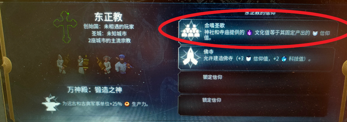 俄羅斯是這個遊戲最簡單的文明之一,前期發了合唱聖歌的話,前三個時代應該應該是完爆劇院。聖歌一出神社加寺廟190生產力就是6文化 ,還有信仰值可以黃金時代爆鋪,在看劇院廣場,440生產力兩個建築才加4文化,真完全沒有可比性,其它信條收益也不高不要選。