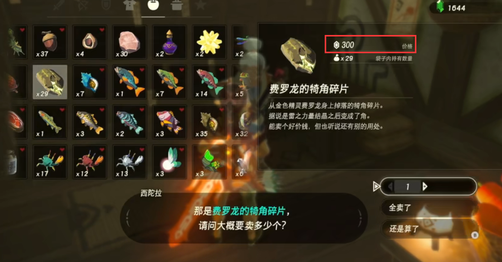 首頁 塞爾達傳說:荒野之息 問答 塞爾達龍角多少錢? 2022-09-11 塞爾達中可以通過刷龍的方式獲得大量的費羅龍的犄角碎片,就是常說的龍角,可以通過賣龍角獲得盧比,在哈特諾村找到商人西陀拉,出售費羅龍的犄角碎片,價格是一個龍家300盧比,如圖所示