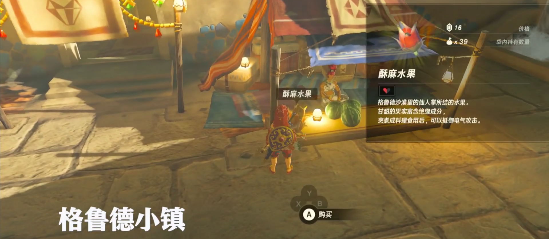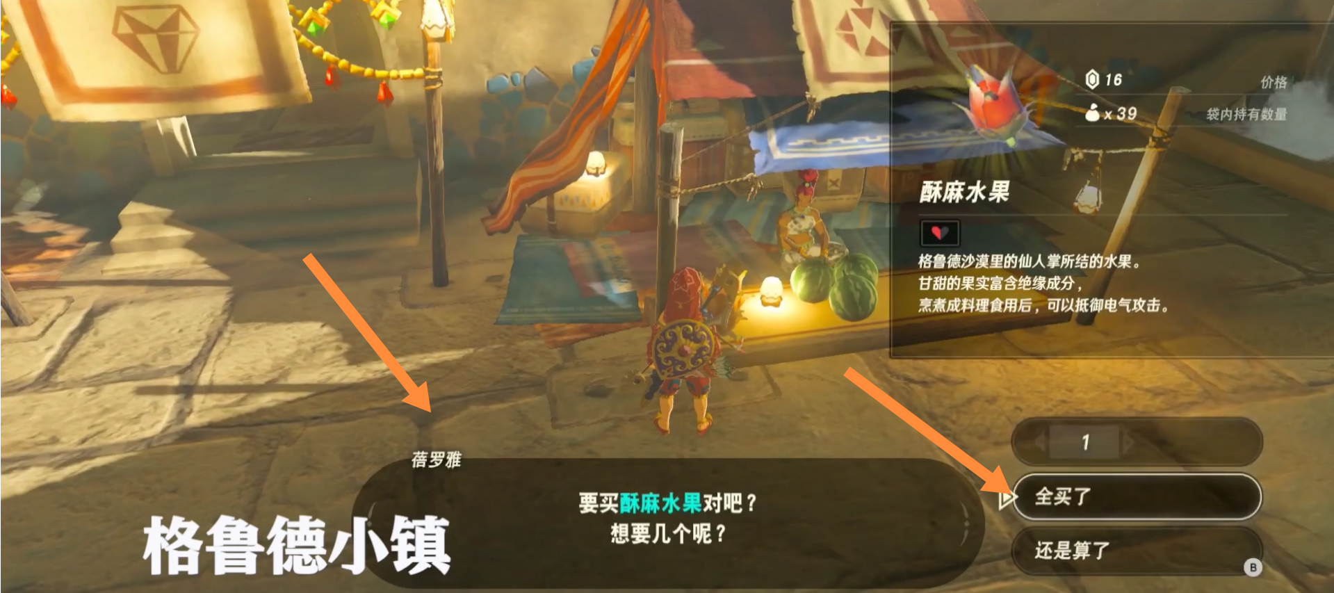 首頁 塞爾達傳說:荒野之息 問答 塞爾達酥麻水果哪裡刷? 2022-09-12 1、刷酥麻水果可以去格魯德小鎮,找到商人蓓羅雅,如下圖所示:2、找到她後就可以購買酥麻水果了,之後等她重新上架酥麻水果後又可以重新購買,如下圖所示: