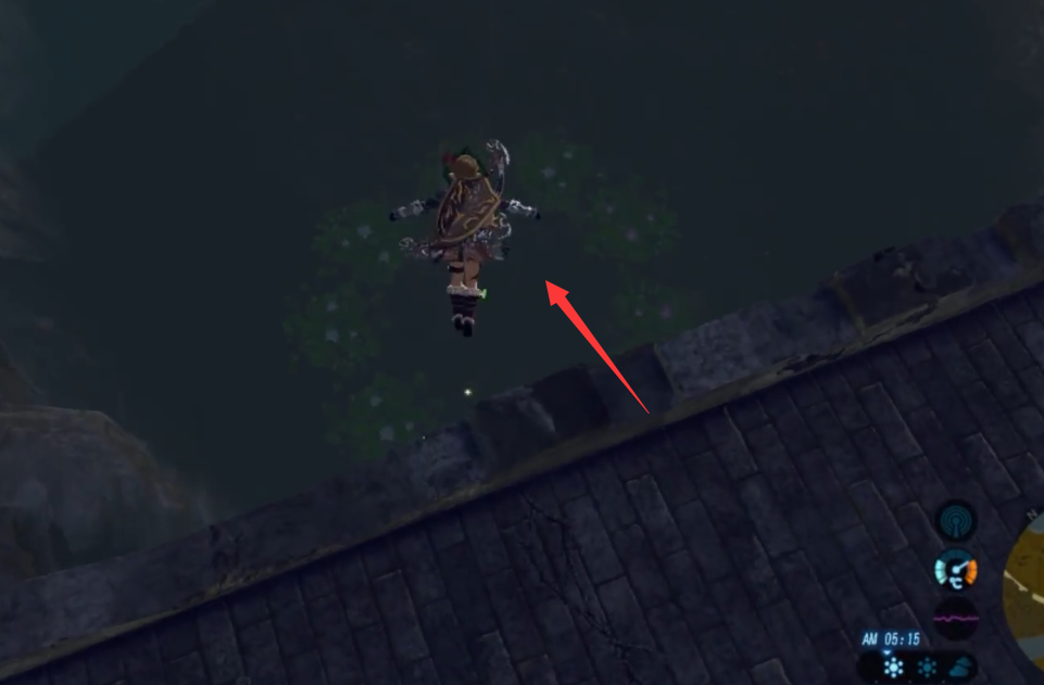 2、然後在橋上往河裡箭頭所指的地方跳。