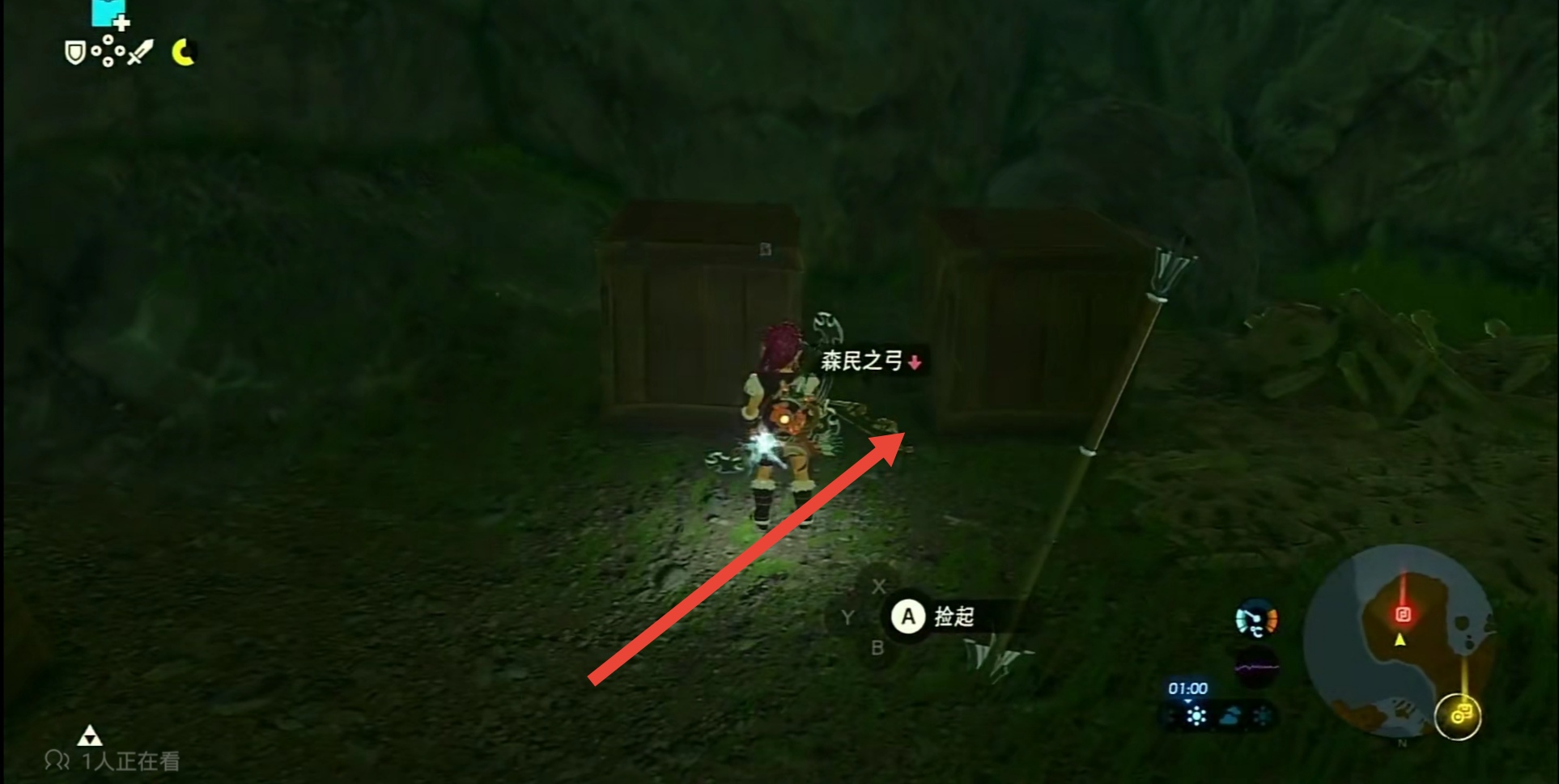 4、進洞後,可以看到兩個箱子,森民之弓就在箱子旁邊,如下圖所示,每次紅月過後都可以在這個地方重新獲得森民之弓。