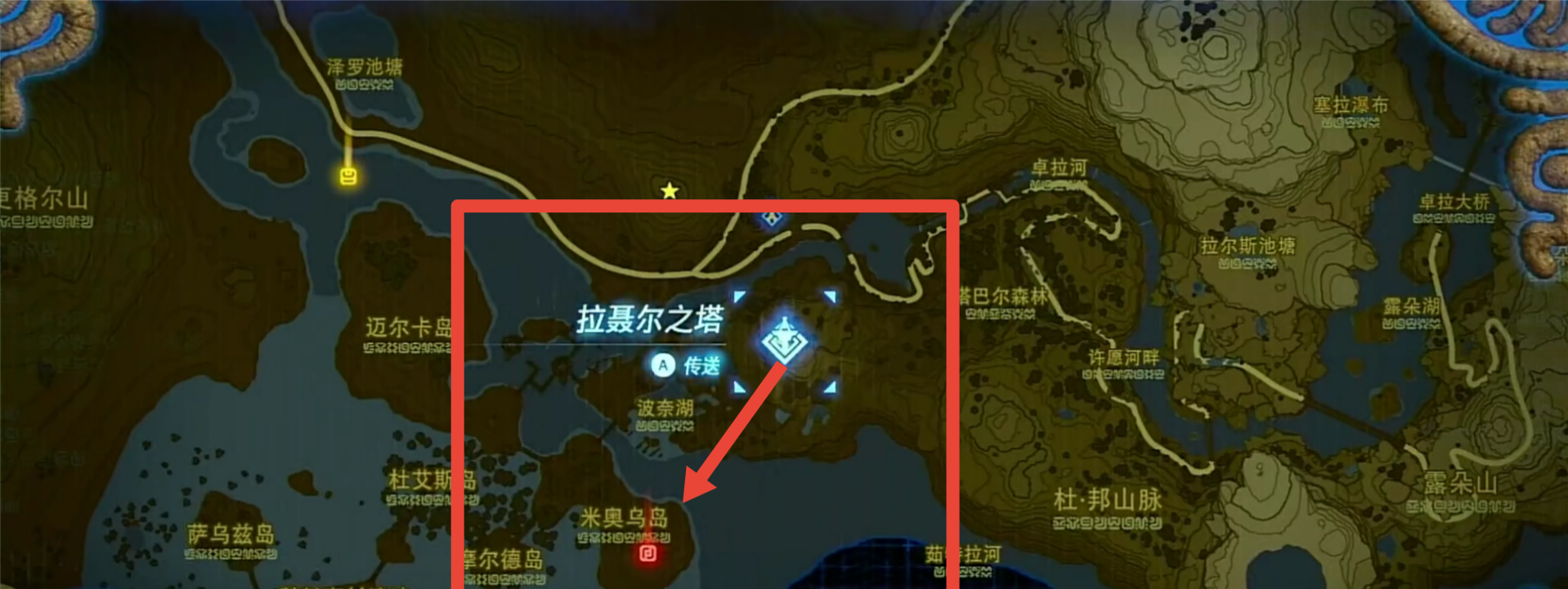 1、玩家首先打開地圖,來到拉聶爾之塔,然後從拉聶爾之塔飛向西南方向米奧烏島的紅色標記處,如下圖所示: