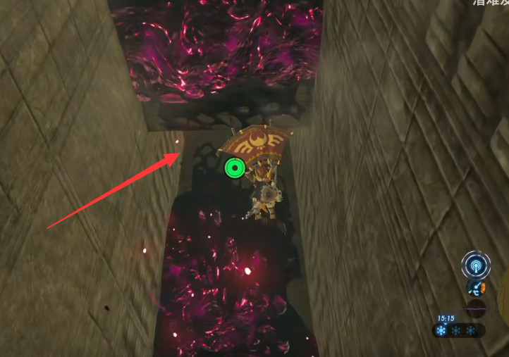 2、滑翔到標注位置時,這里落地處需要注意這些蓋濃的汁液。飛到下圖所指位置。