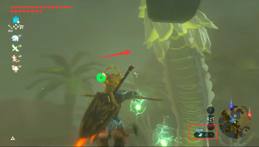 3.然後費羅龍就會從湖中升起,如圖所示就是雷龍,林克對雷龍射箭,聽到叮得一聲之後表示刷成功了