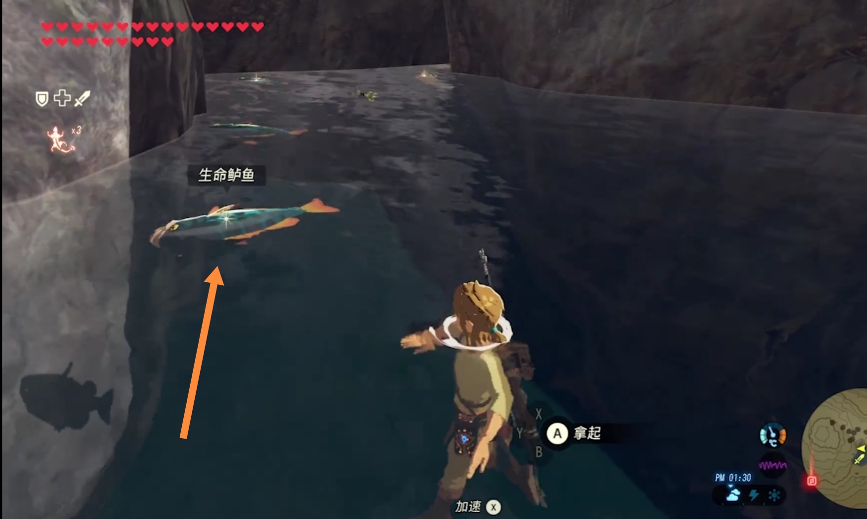 首頁 塞爾達傳說:荒野之息 問答 塞爾達傳說生命鱸魚在哪買? 2022-09-12 1、生命鱸魚不用去買,可以在羅姆山旁邊的一個水池中獲得很多生命鱸魚,位置如下圖所示:2、找到這個水池後,選擇武器或者炸彈向水池攻擊,之後下水池之後就可以按A鍵獲得生命鱸魚了,如下圖所示: