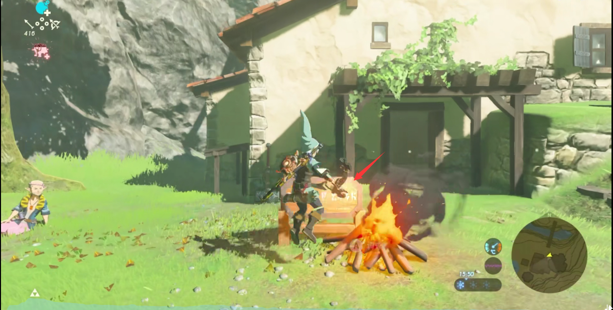 2.在村裡找到圖中的松樹,在松樹前面升起重要道具篝火
