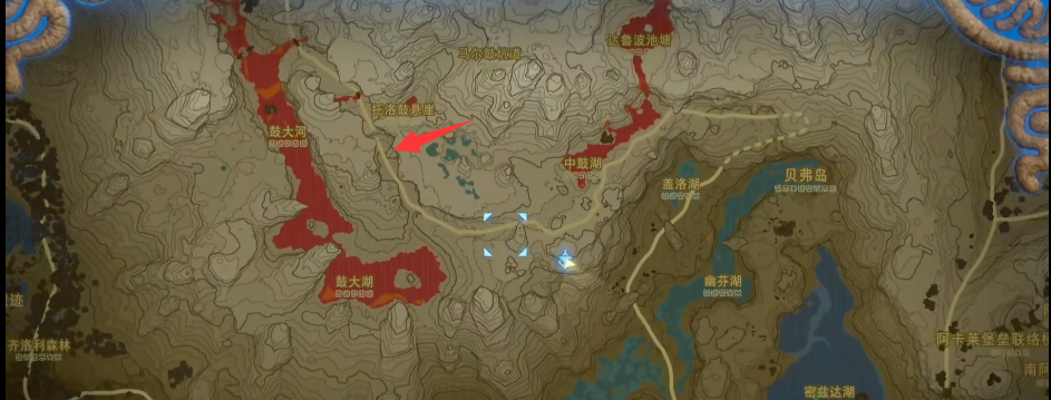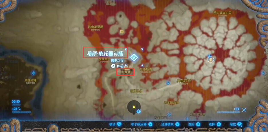 1.塞爾達鼓隆城在奧爾汀地區,希摩依託塞神廟的下方位置,地圖上的位置如圖所示