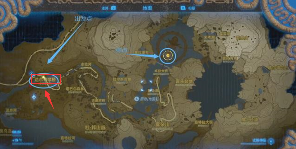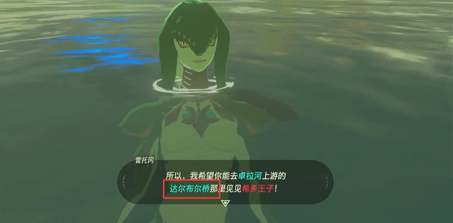 首頁 塞爾達傳說:荒野之息 問答 塞爾達希多王子在哪裡? 2022-09-14 1.塞爾達與雷托岡對話得知希多王子在達爾布爾橋那裡2.達爾布爾橋在地圖上的位置如圖所示3.到達達爾布爾橋這里,橋頭有兩個藍色的柱子,很容易辨別4.下去橋上就能找到卓拉王子希多了