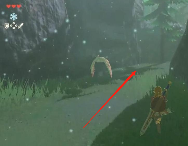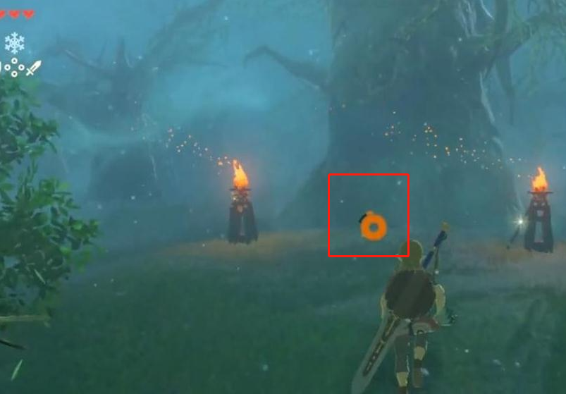 3、到兩個火把和大樹的位置,把視角轉向左邊,面具位置大概在圖中標記方位。