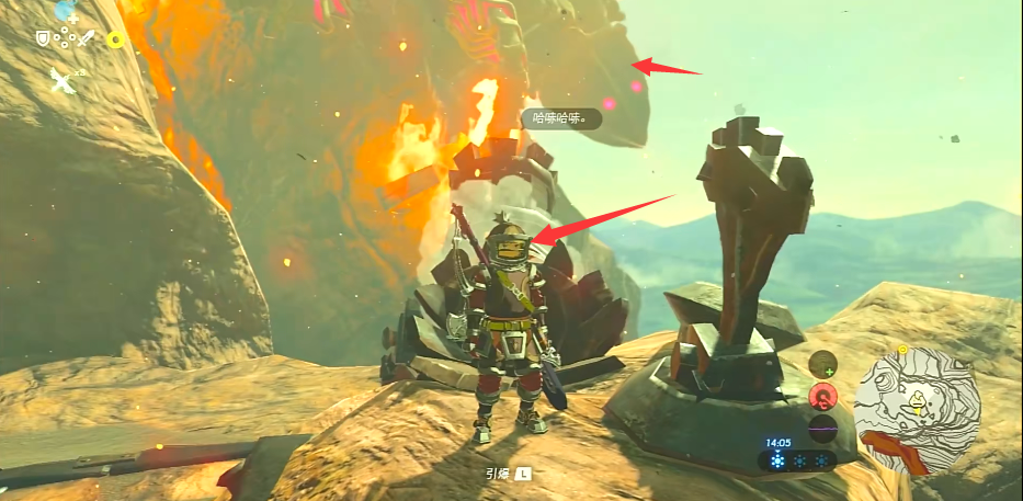 2.蜥蜴神獸上山的辦法就是找到圖中箭頭指向的大炮,配合阿隕對蜥蜴神獸發射炮彈