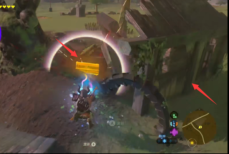 2.到達海拉魯駐軍地遺跡之後,找到圖中所示的房子廢墟,在廢墟的土裡半埋著一個寶箱,使用磁力抓取器就可以很容易看到