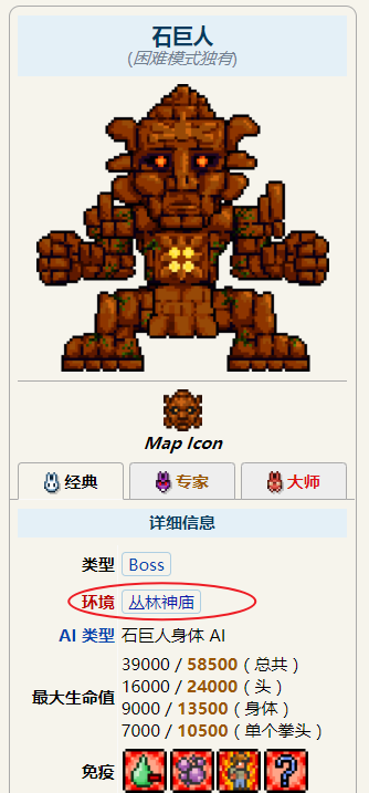 首頁 泰拉瑞亞 問答 泰拉瑞亞石巨人在哪? 2022-09-28 石巨人是困難模式、世紀之花後的Boss,出現在叢林神廟中。在當前世界中打敗了世紀之花之後才能與之戰鬥。石巨人的身體可以穿過物體物塊移動。它所發射的激光、拳頭、和第二階段中不受傷害的頭部則會穿過物塊。