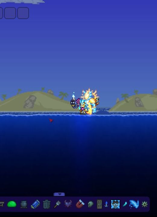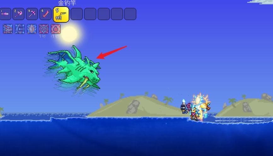 3、浮漂動兩下電機魚竿,就可以召喚泰拉瑞亞豬龍魚公爵了。