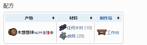 在泰拉瑞亞中,想要製作悠悠球的話,非常簡單,只需要準備10個木材和20份蛛網,在工作台前面進入製作界面就能製作最基礎的木悠悠球了。