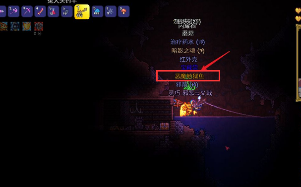 3.洞穴層或森林比較深的位置釣魚,都有概率獲得惡魔地獄魚。