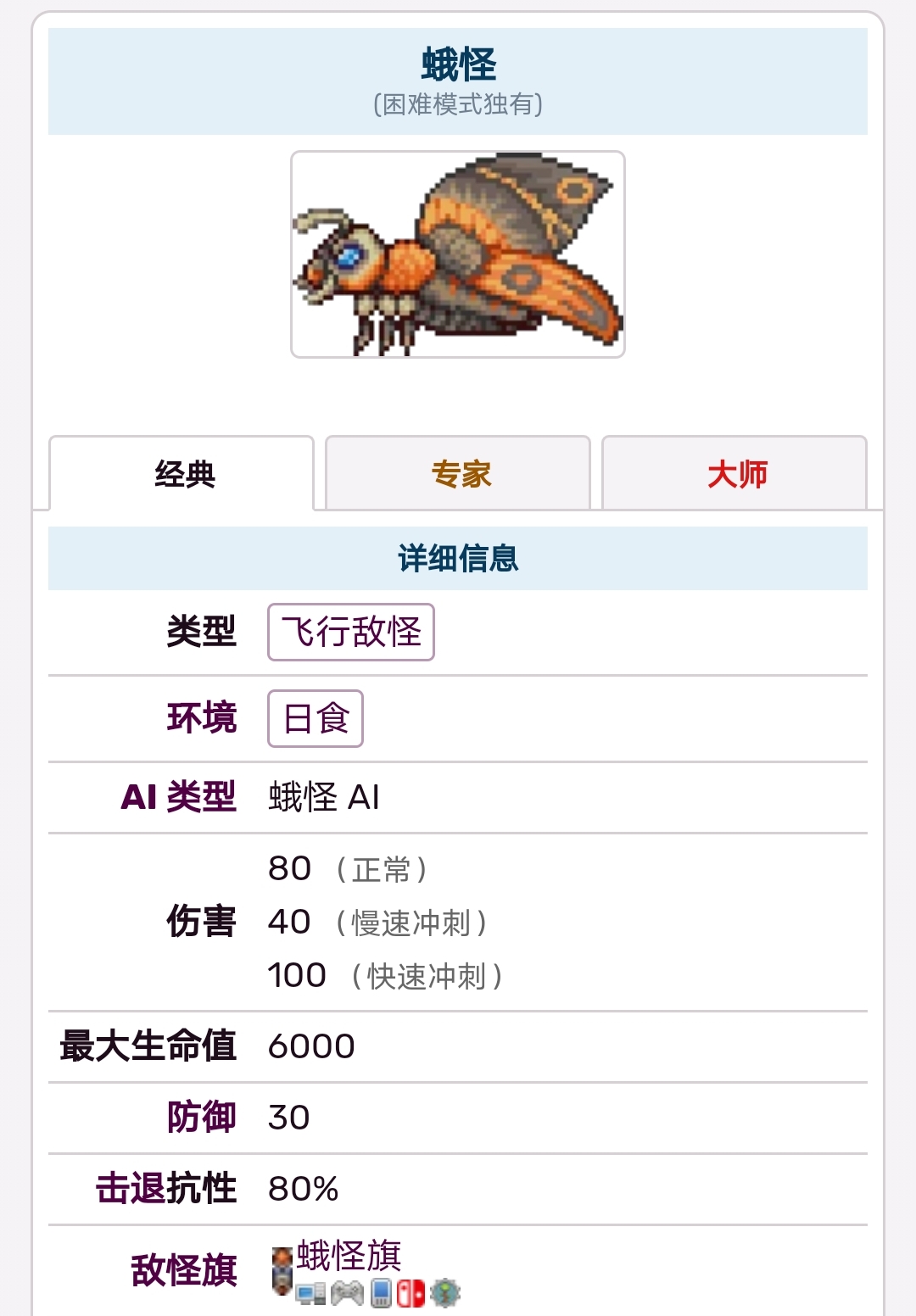 蛾怪是一種強力的飛行敵怪,生成於日食事件期間,並且能穿過物塊。它只會在世紀之花被擊敗後所有機械 Boss都被擊敗後生成。