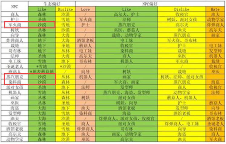 在泰拉瑞亞遊戲中,喜歡沙漠的NPC有三位,分別是蒸汽朋克、染料商以及軍火商,以下是泰拉瑞亞遊戲中全部NPC的喜好大全,可供玩家參考:
