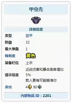 首頁 泰拉瑞亞 問答 泰拉瑞亞甲蟲殼要怎麼獲得? 2022-10-04 泰拉瑞亞甲蟲殼獲得方法:在遊戲《泰拉瑞亞》中,玩家使用秘銀砧或山銅砧製作,所需材料為甲蟲外殼和海龜鎧甲,是僅次於耀斑盔甲的近戰盔甲,甲蟲盔甲有兩種變體,甲蟲鎧甲善於輸出和敏捷,而甲蟲殼善於防禦,玩家就可以獲得甲蟲殼。