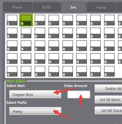 6.再Inv標籤里設置物品,但是該版本是沒有圖標的。第一個下拉框是道具列表,第二個下拉框是品質列表,在Amount處輸入數值為加入列表道具數量。