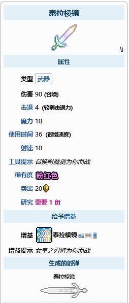 召喚師最強的武器不必多說,當然是泰拉棱鏡了,它是泰拉瑞亞當中召喚傷害最高的武器,也是最難獲得的召喚武器,它需要在白天打光之女皇,並且要在白天擊敗光之女皇才能夠獲得,白天的光之女皇處於暴怒狀態,每一擊都能夠殺死玩家,獲得的難度可想而知。