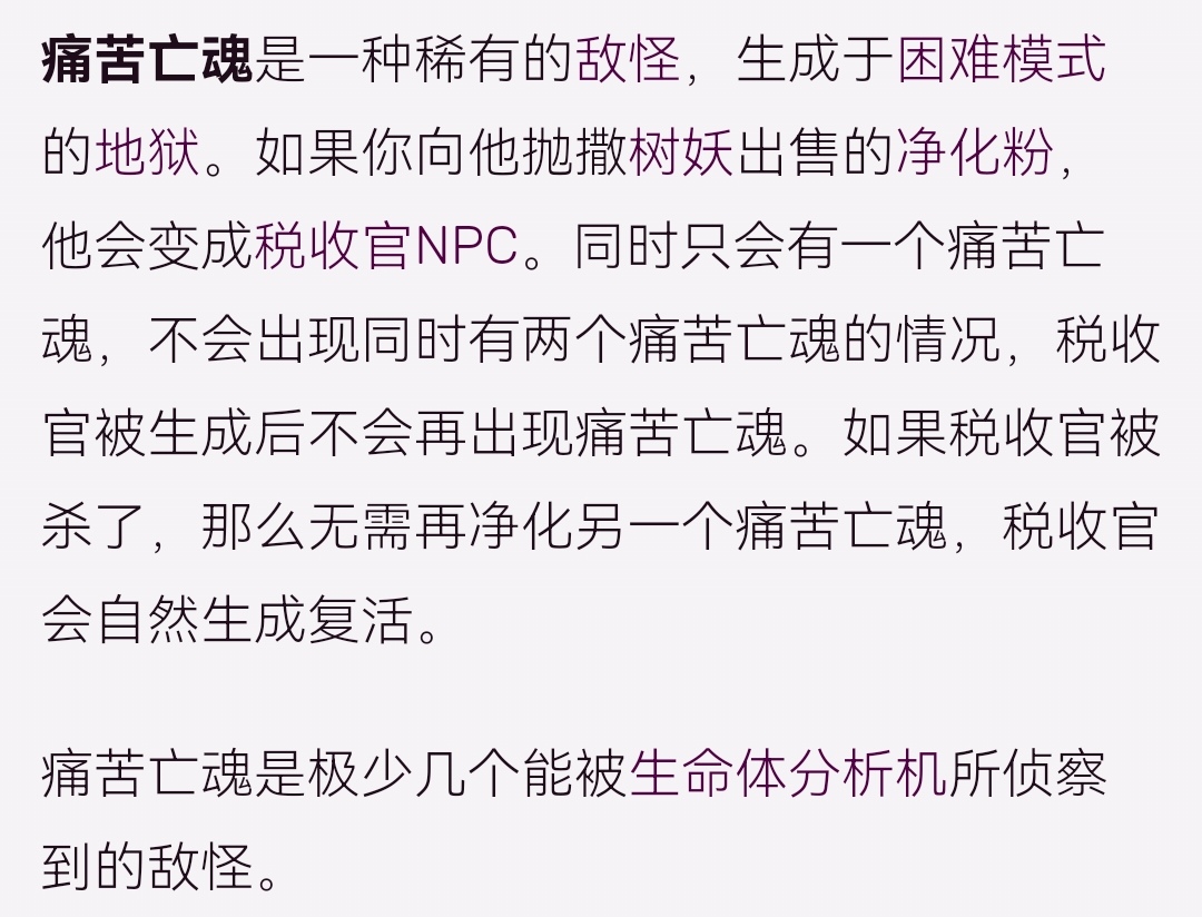 痛苦亡魂是在困難模式的地獄當中生成的,是一種比較稀有的怪物,當你向他拋出凈化粉時,他就會變成稅收官,並且它同時最多隻能生成一個。