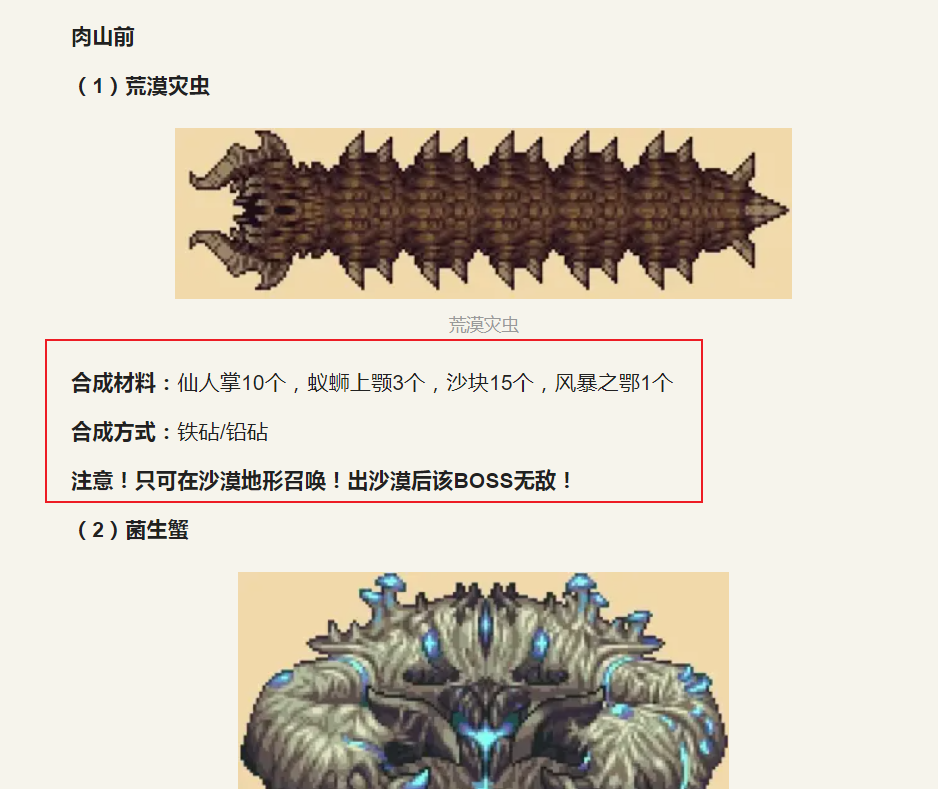 首頁 泰拉瑞亞 問答 泰拉瑞亞淵海災蟲怎麼召喚? 2022-10-08 玩家可以使用10塊仙人掌,3個蟻螄上顎,15個沙塊,1個風暴之鄂前往鐵砧或鉛砧合成出荒漠蟲食。玩家攜帶荒漠蟲食前往沙漠地區可以召喚出荒漠災蟲。