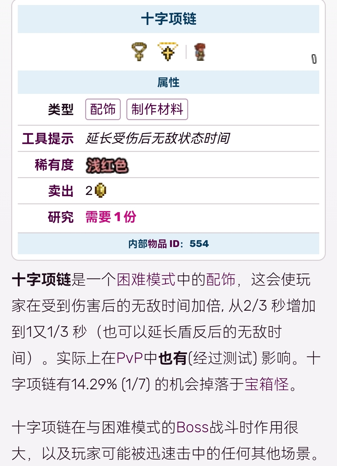 首頁 泰拉瑞亞 問答 泰拉瑞亞十字架項鏈怎麼獲得? 2022-10-10 十字架項鏈是通過打敗在地下生成的寶箱怪獲得的,它的作用是在被攻擊之後有一段無敵的時間,也就是說在這段時間內,玩家在這一段時間被攻擊後是不受傷的,對於戰士而言,這是一個很好的飾品。
