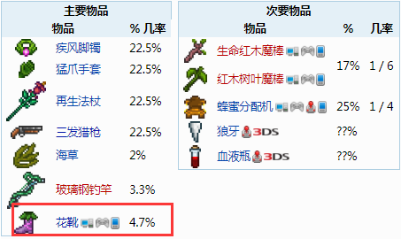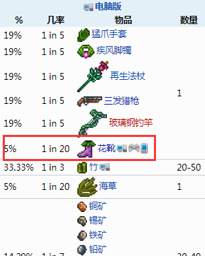 首頁 泰拉瑞亞 問答 泰拉瑞亞花靴怎麼獲得? 2022-10-11 泰拉瑞亞花靴屬於不常見的配飾類物品,有一定的幾率在常春藤箱及叢林匣中發現。花靴只在普通草塊、叢林草塊和神聖草塊上有作用,效果是當玩家踩在草上時,它會在你的腳下生成花。1、常春藤箱花靴掉落率如下:2、叢林匣花靴掉落率如下: