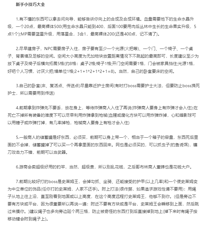 首頁 泰拉瑞亞 問答 泰拉瑞亞小技巧都有什麼? 2022-10-11 泰拉瑞亞小技巧,包括在夜晚之前要蓋好房子,新人首先去沙漠挖仙人掌做仙人掌套裝,前期裝備不夠時不要去挑戰boss,不知道合成一類的拿東西去問嚮導。
