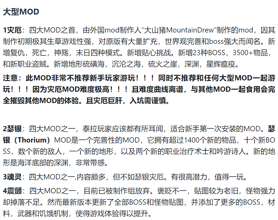 【泰拉瑞亞】的四大MOD指的分別是是:【瑟銀,災厄,震顫,魂靈】這四個MOD,四大mod作為泰拉瑞亞玩家必過的mod在所有的mod存在著特殊的優勢,除了時間比較久外,可玩性相對年輕的mod來說,也更加完善,大大增加主體遊戲外的樂趣。