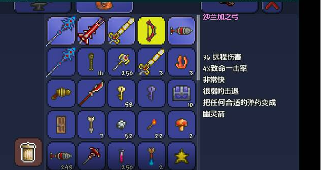 1、前期沙蘭加之弓。有擊退,能把彈葯變成幽靈箭。