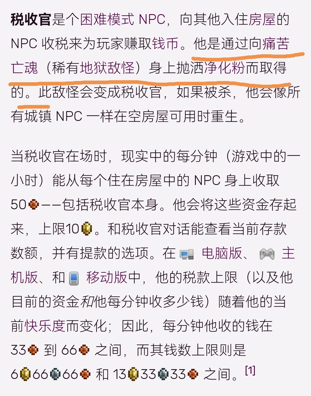 首頁 泰拉瑞亞 問答 泰拉瑞亞稅收官怎麼入駐? 2022-10-11 玩家只要在地獄當中向痛苦亡魂拋灑凈化粉,他就會變成稅收官,然後就可以入住了。在地獄當中,一次只會生成一個痛苦亡魂,不會出現兩個痛苦亡魂的情況,玩家也就不需要擔心會擁有兩個稅收官。