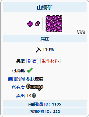 首頁 泰拉瑞亞 問答 泰拉瑞亞山銅長什麼樣? 2022-10-12 山銅礦的樣子如下圖所示,是帶紫色的,在小地圖上顯示的也是紫色,山銅礦可以用來製作出山銅錠,然後用來製作山銅套裝,用來製作出鎬子,能夠採集鈦金礦和精金礦。