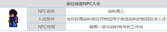 首頁 泰拉瑞亞 問答 泰拉瑞亞怎麼吸引染料商人? 2022-10-12 燃料商人是一個城鎮NPC,需要一套房子方能入住。具體條件見下圖:當你獲得染料或任何物品用於製造染料的物品後染料商人才會入住,在電腦版泰拉瑞亞中,他會使用武器反擊攻擊他的敵人,他死後會掉落他所使用的的武器。