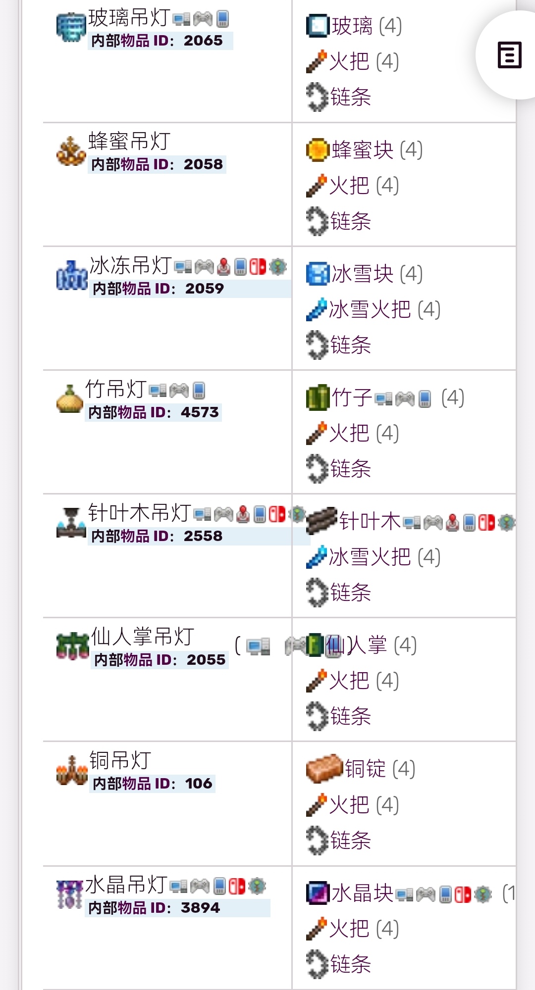 首頁 泰拉瑞亞 問答 泰拉瑞亞吊燈怎麼做? 2022-10-13 在泰拉瑞亞當中製作吊燈需要4個火把,一個鏈條和4個其他材料。例如你製作竹吊燈就需要一個鏈條,4個火把4個竹子,製作冰吊燈就需要4個冰火,把一個鏈條和4個冰雪塊,製作仙人掌吊燈就需要4個火把,一個鏈條4個仙人掌,以此類推。