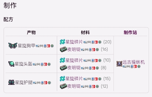 星旋盔甲用星旋碎片和夜明錠製作。一整套星旋盔甲需要用45個星旋碎片和36個夜明錠。星旋碎片是一種困難模式下的石巨人後製作材料。在月亮事件中由星旋柱掉落。掉落數量為 12 - 60 個。 製作所有的星旋套裝、武器和工具需要 121 星旋碎片和 68 個夜明錠(即 272 個夜明礦)。