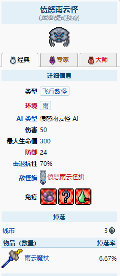 首頁 泰拉瑞亞 問答 泰拉瑞亞憤怒雨雲怪在哪刷? 2022-10-13 泰拉瑞亞遊戲中,憤怒雨雲怪是一種困難模式敵怪,當下雨時在除雪原生物群落外的任意地表生物群落中生成,它會在地圖上跟隨玩家,試圖用類似於猩紅魔杖和雨雲魔杖的雨類攻擊殺死玩家。