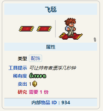 泰拉瑞亞遊戲里的飛毯屬於配飾類物品,能讓玩家漂浮大約四秒鐘,類似於懸浮板。激活後,玩家就會被放在一個假想的水平軌道上飛行。