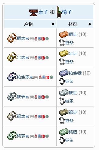 首頁 泰拉瑞亞 問答 泰拉瑞亞鍾表用什麼做? 2022-10-14 在遊戲泰拉瑞亞中,表有很多種分別是銅表、金錶、鉑金錶、銀表、錫表和鎢表,各種表都可以通過使用十個對應的金屬錠和鏈條在桌子和椅子前合成。
