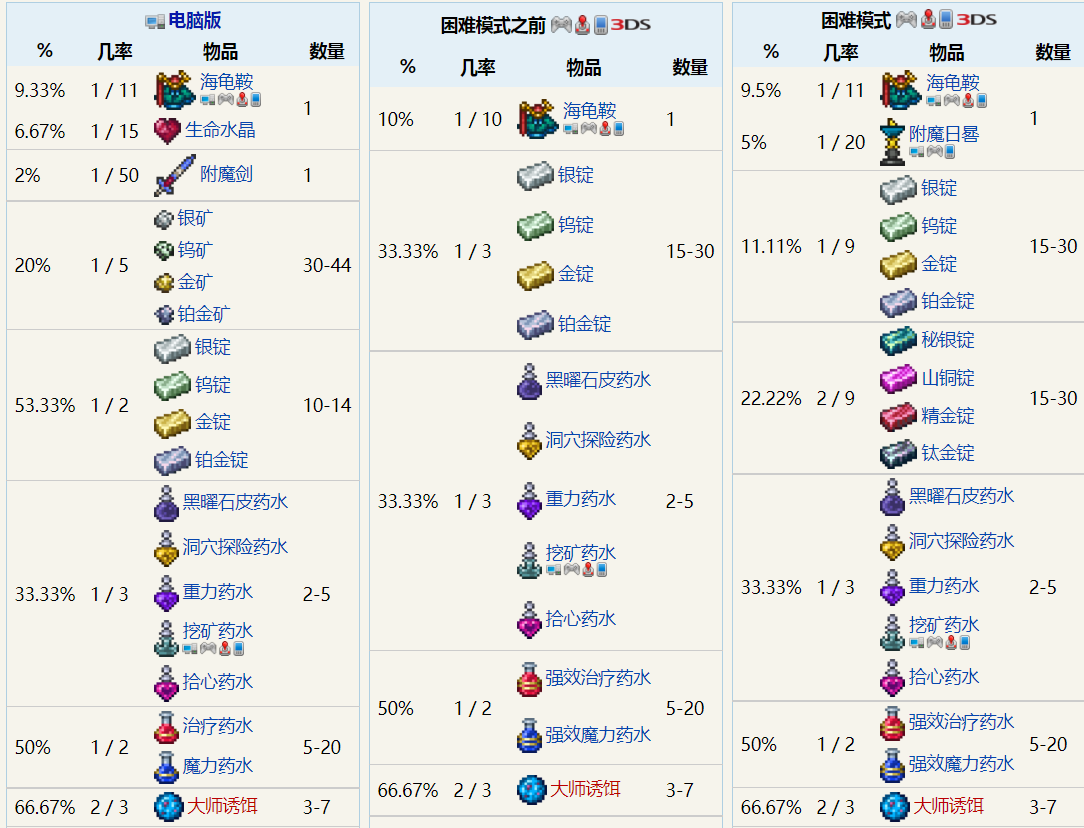 首頁 泰拉瑞亞 問答 泰拉瑞亞金匣能開出什麼? 2022-10-14 泰拉瑞亞金匣能開出:海龜鞍、銀錠、鎢錠、金錠、鉑金錠、黑曜石皮葯水、洞穴探險葯水、重力葯水、挖礦葯水、拾心葯水、強效治療葯水、強效魔力葯水、大師誘餌、金幣等。具體如下: